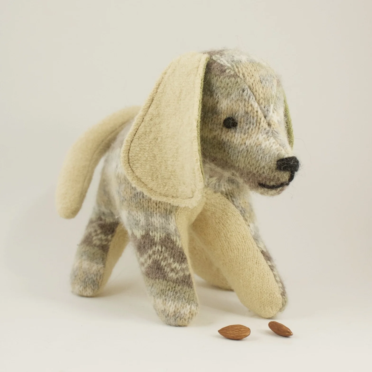 The softest wool recycled sweaters are chosen for these soft bunnies who will hop their way into hearts young and old. Larger bunnies are perfect for a good snuggle, ear scratch, and place to rest a small head on. The smallest bunnies fit cozily into the palm of a hand. Standing bunnies of two sizes hold their favorite treats just as you will these sweet bunnies.