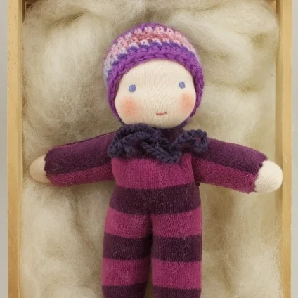 Cuddly and sleepy babies are soft and light. Small heads are covered with tiny hand crocheted caps and their bodies are stuffed with airy wool fleece. Palm babies heads and hands are made from soft jersey and their expressive faces are minimal with hand sewn features and rosy cheeks.